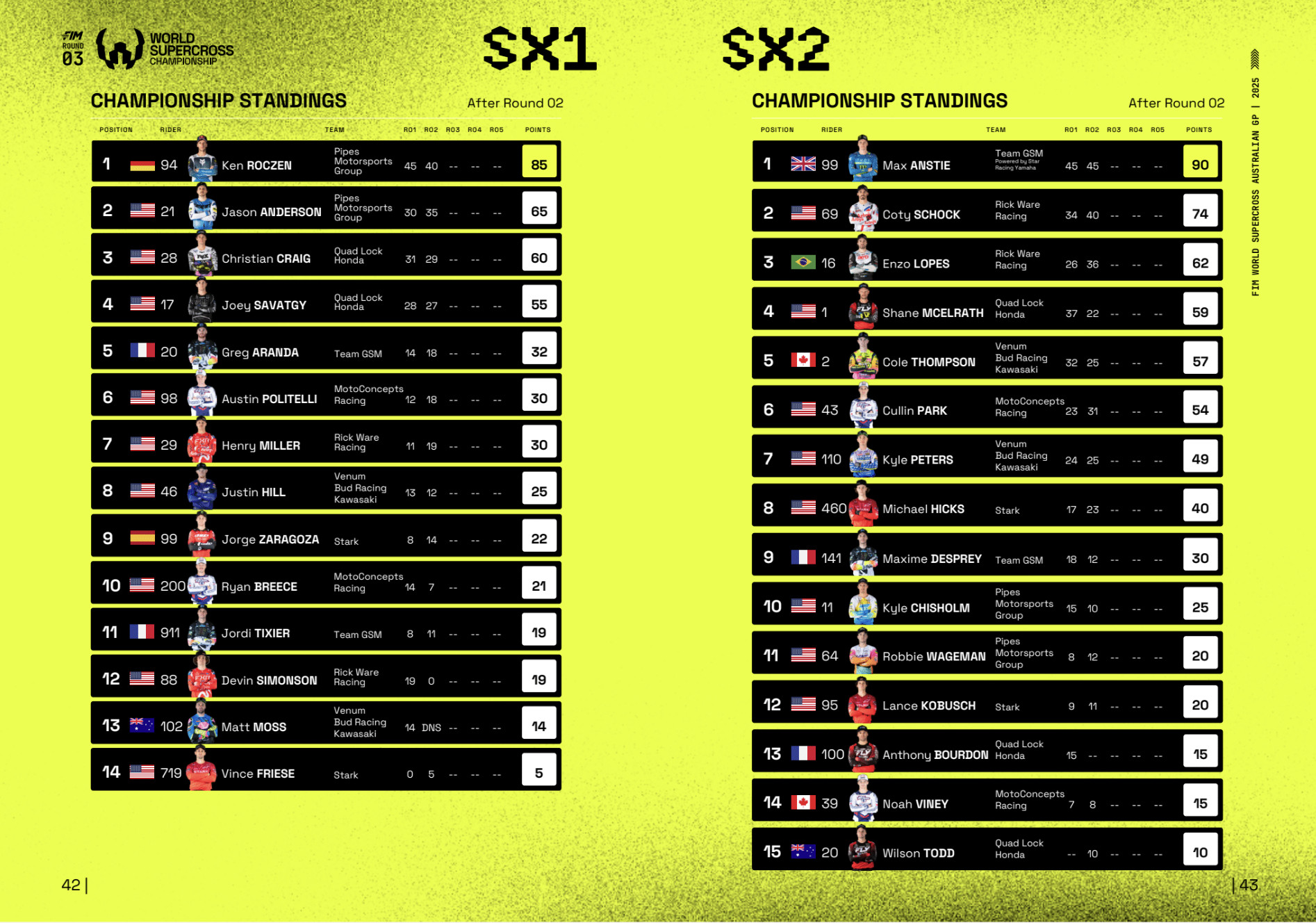 Gold Coast, Australia – A sold-out Cbus Super Stadium witnessed one of the most memorable evenings of the season as the FIM World Supercross Championship delivered a spectacular third round on the Gold Coast. With the atmosphere at fever pitch and an all-star lineup on track, Ken Roczen produced a trademark performance to take the overall SX1 victory, Christian Craig claimed an emotional race victory, and Cooper Webb claimed third place on the podium in his championship debut. Meanwhile, Max Anstie extended his perfect SX2 season in another display of unrivalled control.