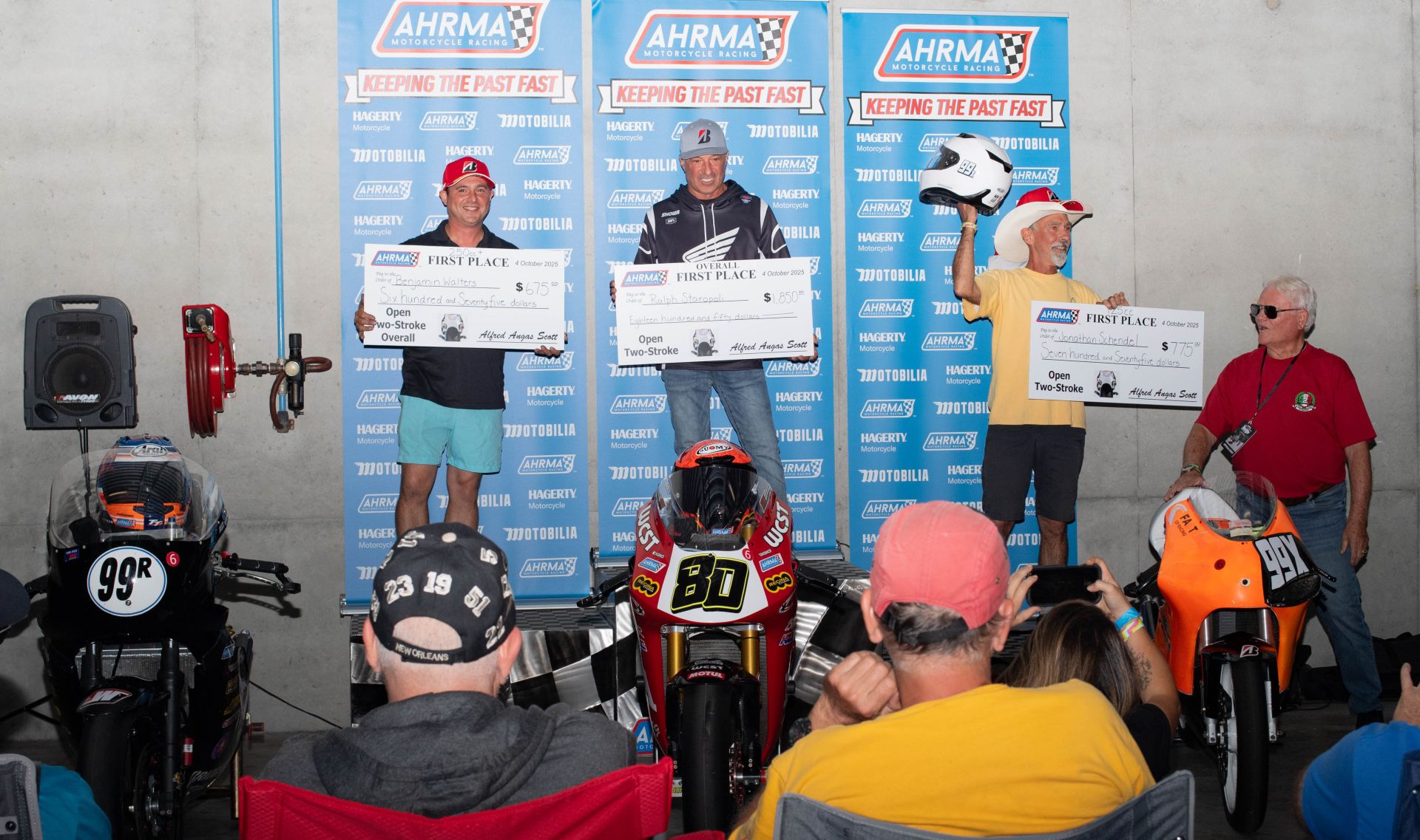 Staropoli not only raced but also organized the prize fund, securing sponsorship from several anonymous AHRMA racers, Rising Sun Cycles, Iconic Motorbikes, and Mojo Yamaha for a total purse of $6,300. All Points Manufacturing specifically contributed the portion of the purse designated for racers finishing fifth through tenth. Bridgestone Tires also donated a set of race tires to the overall winner.