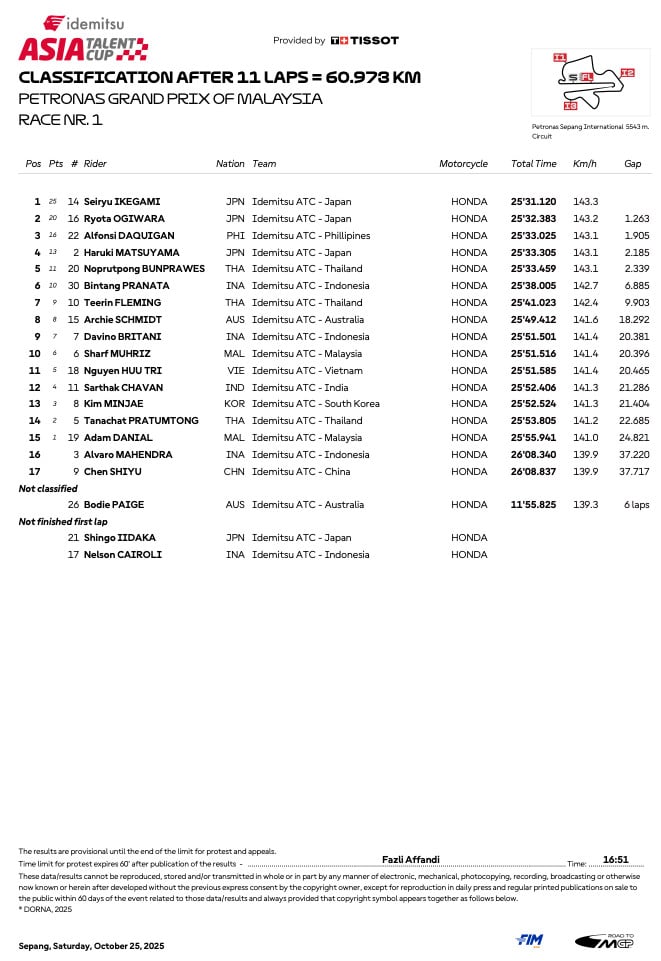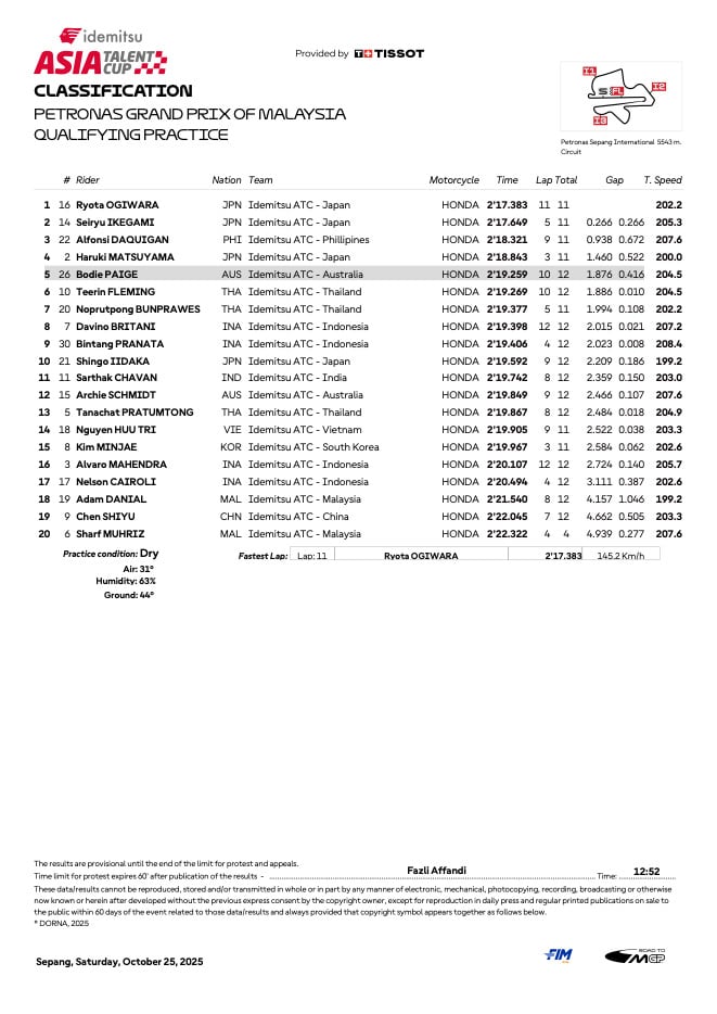 A week after racing a Team Hammer Suzuki GSX-R750 with ASRA during his Daytona debut, MotoAmerica Talent Cup race winner Bodie Paige finished 5th in Idemitsu Asia Talent Cup Qualifying session held on Saturday of the MotoGP event weekend In Malaysia, at the Petronas Sepang International Circuit. Wild-card rider Paige set a time of 2:19.259 (+1.876).