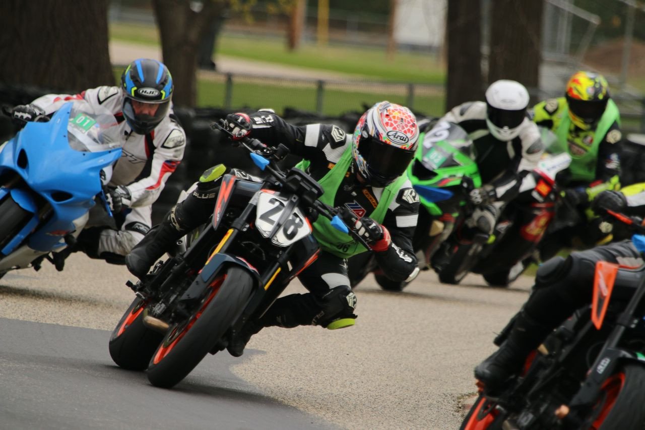 Advanced Basics 301 Lead Instructor Sam Kok (28), 2016 AMA Expert Supersport 1000 champion, demonstrates proper body position to his students through T4 at Blackhawk Farms Raceway, South Beloit IL. Photo by ZonePhoto/Jim Lilly