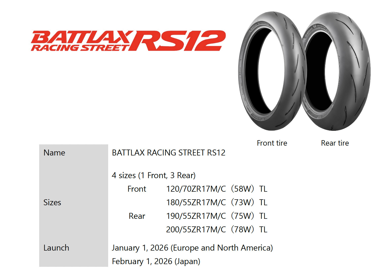 NASHVILLE, Tenn. — Bridgestone Corporation (Bridgestone) today announced that it will launch the premium sports motorcycle tire BATTLAX RACING STREET RS12 in January 2026 for North American markets. Under the concept of ‘From Circuit to Street,’ by incorporating race tire technology, BATTLAX RACING STREET RS12 delivers the highest level of dry grip performance in the road-legal tire lineup of BATTLAX.
