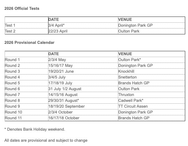 There will be two official tests prior to the start of the 2026 season, with the first taking place in April at Donington Park, before moving to Oulton Park ahead of the opening round.