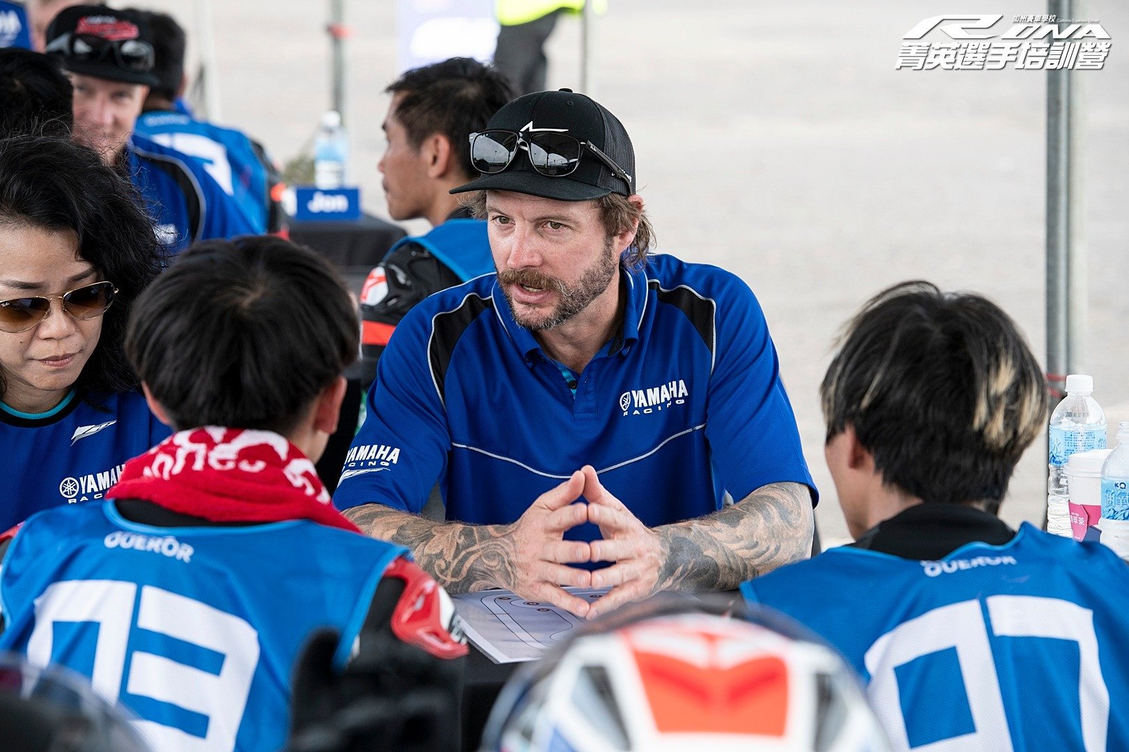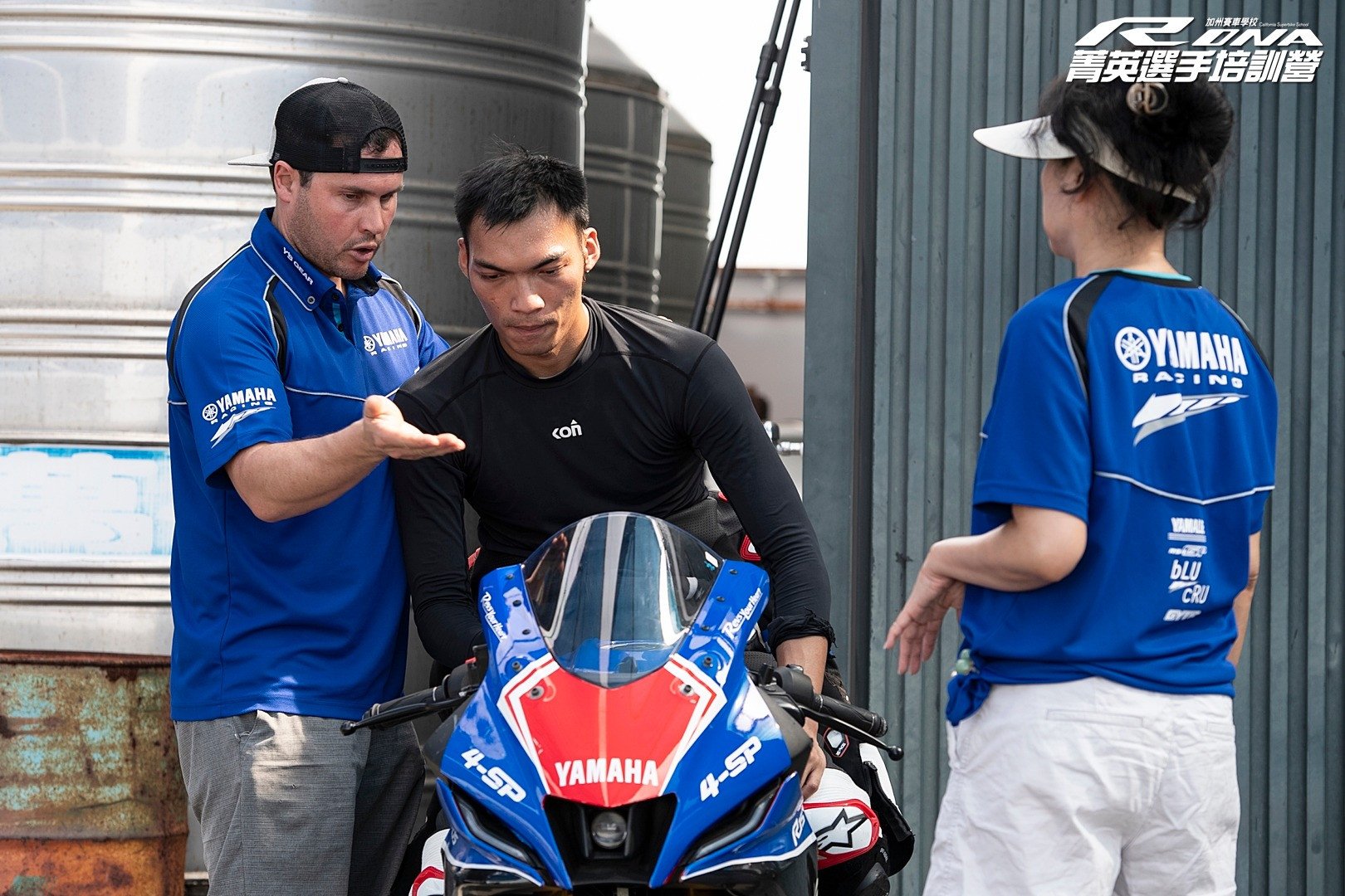 California Superbike School coach Adam Raffe works with students at an RDNA camp, with a translator at left. Photo courtesy Yamaha Taiwan.