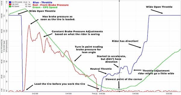 Tino’s goal is to use the brakes to get to the slowest point at the exact speed and lean angle he is comfortable with for the corners radius, lean angle, and level of grip. Tino does a pretty good job and the brake release happens at 67 mph, and the true slowest point arrives at 62 mph a heartbeat later.