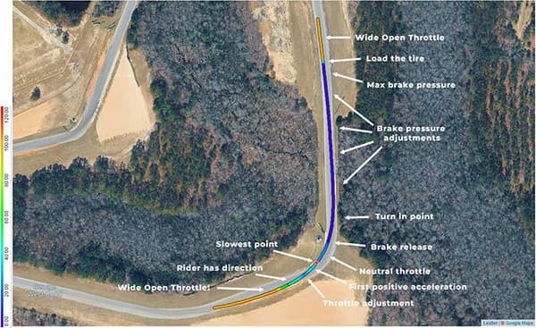 To understand how a true professional rides, we analyzed his data from a “spirited” lap on a Yamaha MT-10 with Bridgestone DOT street tires, through Turn 8 at Carolina Motorsports Park.