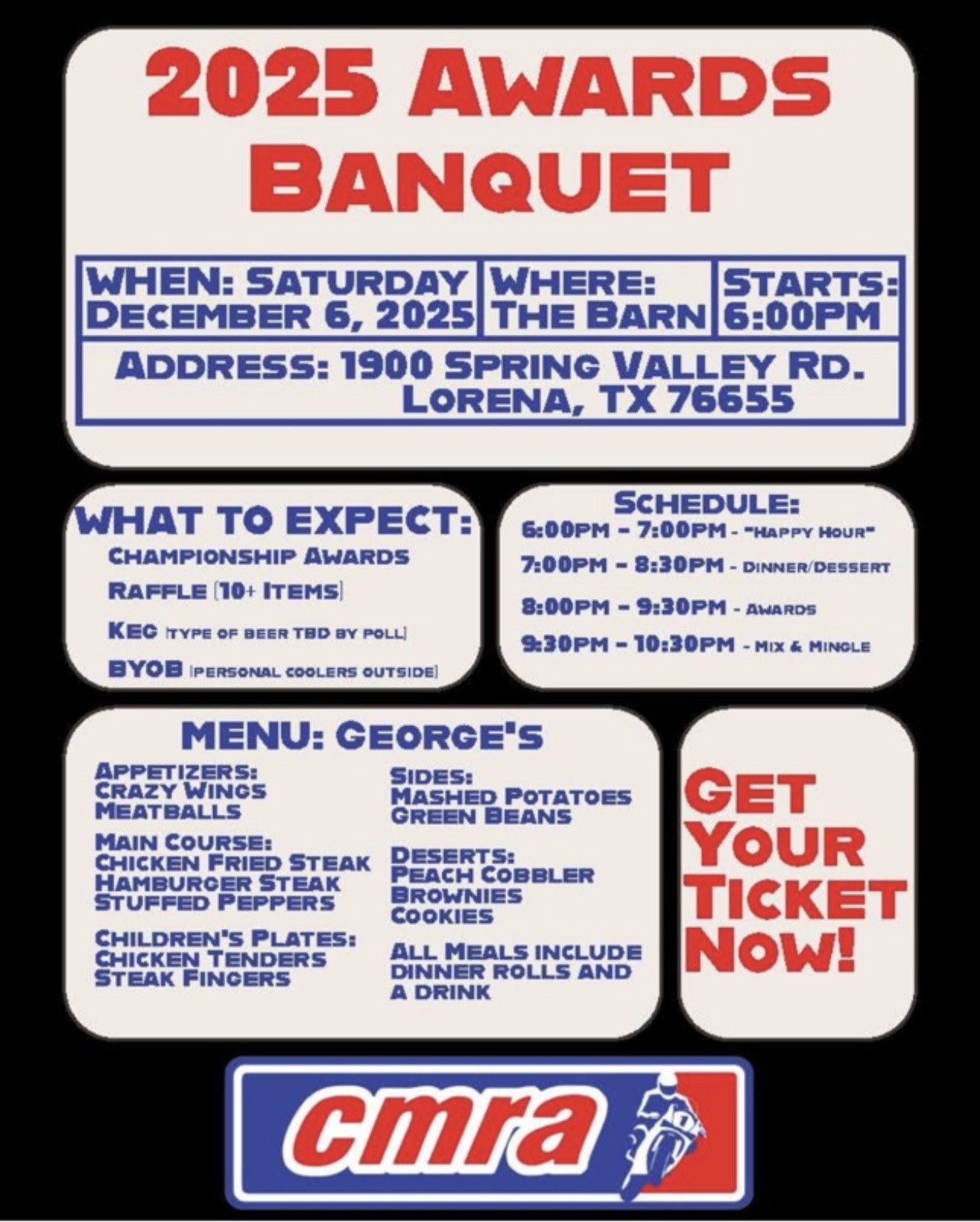 The Central Motorcycle Roadracing Association (CMRA) has officially opened ticket sales for its 2025 Awards Banquet, scheduled for Saturday, December 6, 2025, at The Barn, located at 1900 Spring Valley Road, Lorena, TX 76655.