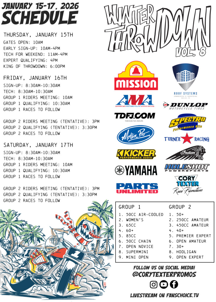 While flat track is not Nathan’s primary background, the Winter Throwdown represents a unique chance to expand his skill set, race craft, and adaptability as a developing athlete. Competing in flat track has long been recognized as an important tool for rider development, and this opportunity allows Nathan to gain experience against strong competition in a demanding format.