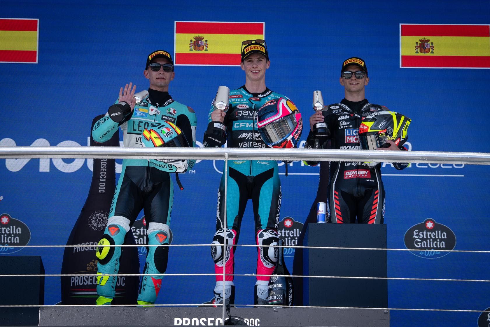 An epic battle in Moto3 saw the return of Maximo Quiles (CFMOTO Gaviota Aspar Team) to the top of the podium as he took a second win of the year at home in Jerez. The #28 had to fight hard before pulling clear in the closing stages, whilst the fight for second saw rivals Adrian Fernandez (Leopard Racing) and David Muñoz (LIQUI MOLY Dynavolt Intact GP) go head-to-head on the final lap, eventually going to the #31 ahead of his returning compatriot.