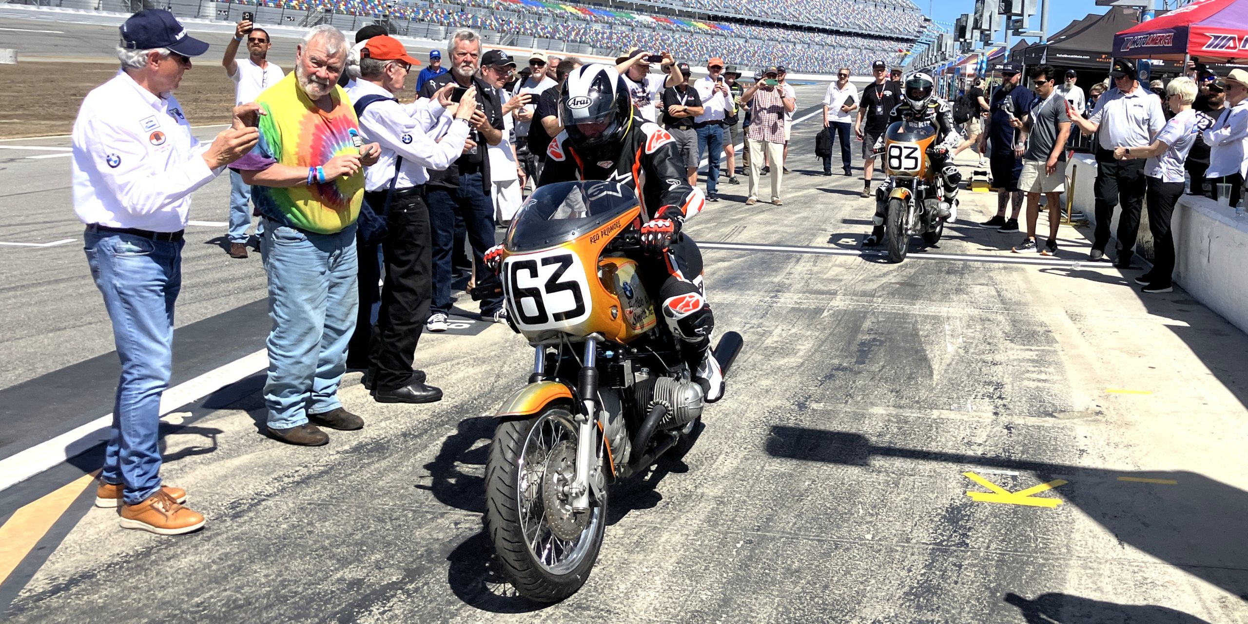 1976 BMW racebikes on the hot pit lane at Daytona in 2026. Photo by Michael Gougis.