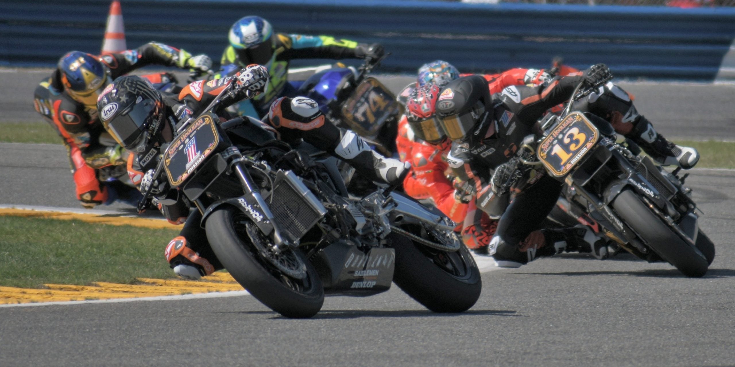 James Rispoli (1) leads Cory West (13) in the Mission Super Hooligan race at Daytona on Friday. Photo by Michael Gougis.