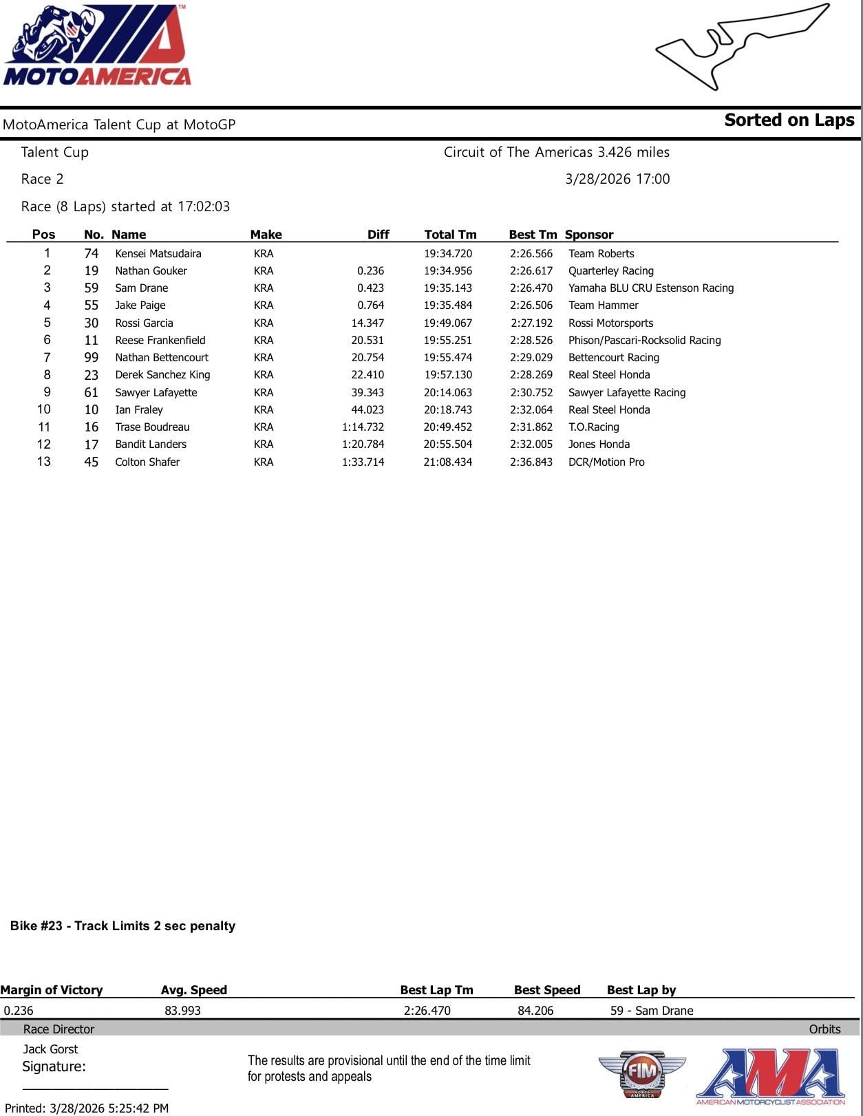 “You know, it’s awesome to be racing with MotoGP alongside them this weekend, and race two was really good for me. I got the holeshot, and I just stayed in front for most of the race, obviously, having some battles with Nathan, Jake, and Sam throughout the entire race.