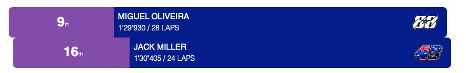 Jack Miller‘s day, on the other hand, was more of a step backwards. After setting the sixth fastest time in FP1 in the morning, he struggled in the afternoon to find the right feeling (and timing, slowed down also by yellow flags) to put together a lap fast enough to break into the session‘s top 10. With the 16th time at the end of Practice, Miller will now have to fight through Q1 tomorrow in search of one of the two available spots to advance into Q2.