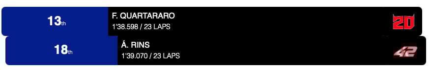 “Jack started well, setting his best time on the new tyre when the track offered good grip. The afternoon rain created some confusion and reduced grip significantly. Between the two sessions, we worked a lot to help Miguel make a step forward, and tomorrow we‘ll try an important change to give him better support. Unfortunately, Jack couldn‘t make it directly into Q2, but we have some ideas to try”.