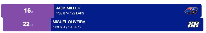 Miguel Oliveira: “The tricky weather conditions made our day complicated. We worked on the bike setup to find the feeling we were looking for, but unfortunately, the changes we tried didn‘t give us the results we hoped for. Tomorrow we‘ll face an uphill Saturday, but we‘ll keep pushing to turn things around”.