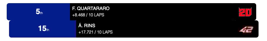 Rins commenced the 10-lap dash from P10 but fell back to twelfth on the first lap. In the two following laps he engaged in a brief battle with a charging Bezzecchi and Enea Bastianini and was relegated to P14. The number-42 rider briefly gained a position when Mir crashed on lap 5, but over the course of lap 3-6 he dropped to P16 as he was unable to ride defensively like he wanted to. A crash by Luca Marini on lap 8, had the Spaniard holding 15th position when he arrived at the chequered flag, which he took 17.721s from the winner.