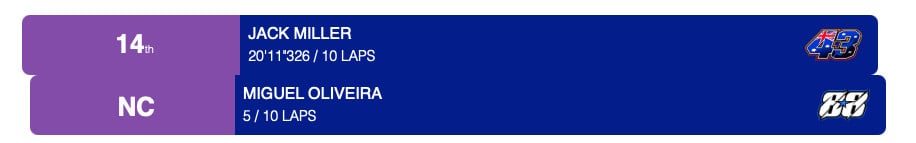 Caught in the chaos of Turn 1, Miller lost several positions at the start and ended the opening lap in 15th place. Oliveira also dropped back to 20th. His race was cut short by a low-speed crash at Turn 1 early on lap six, while occupying 18th place. Miller, after battling in the opening laps, stabilized his pace and finished 14th. Tomorrow‘s Grand Prix, scheduled for 3:00 p.m. local time (8:00 a.m. CET), will be a chance to fight back.
