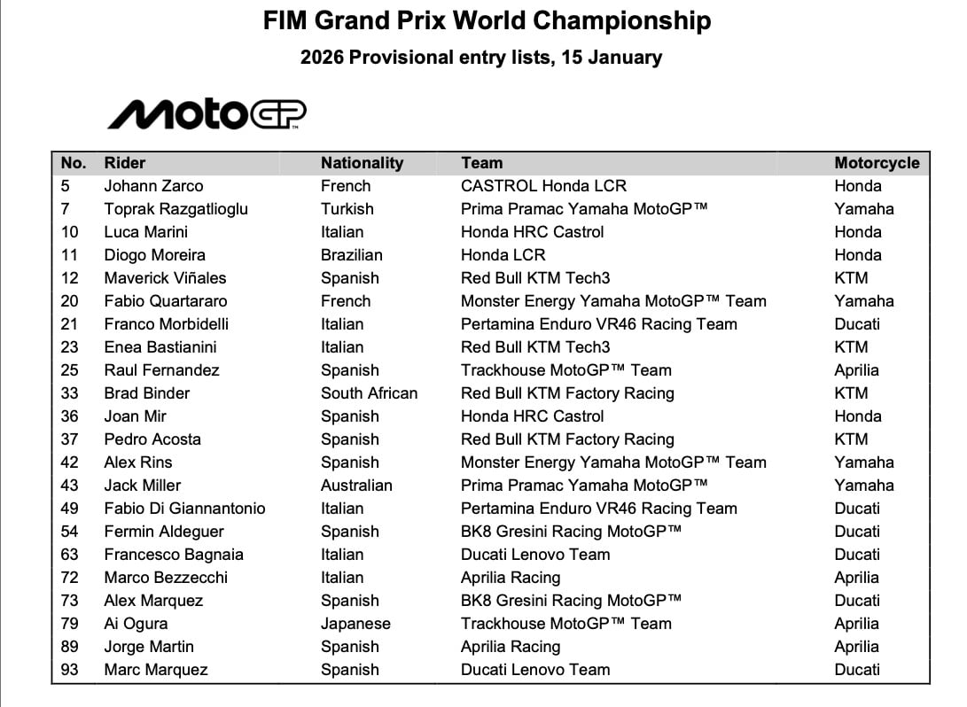 The provisional Entry Lists for the 2026 FIM Grand Prix World Championship can now be announced.