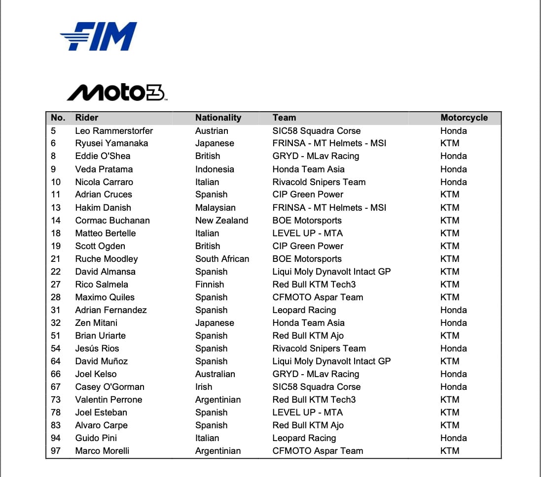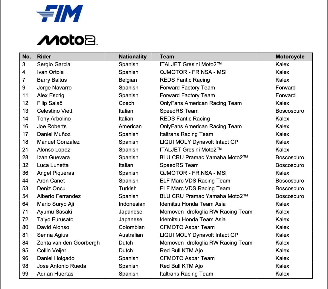 FIM Grand Prix World Championship 2026 Entry Lists: MotoGP™ Moto2™ Moto3™.