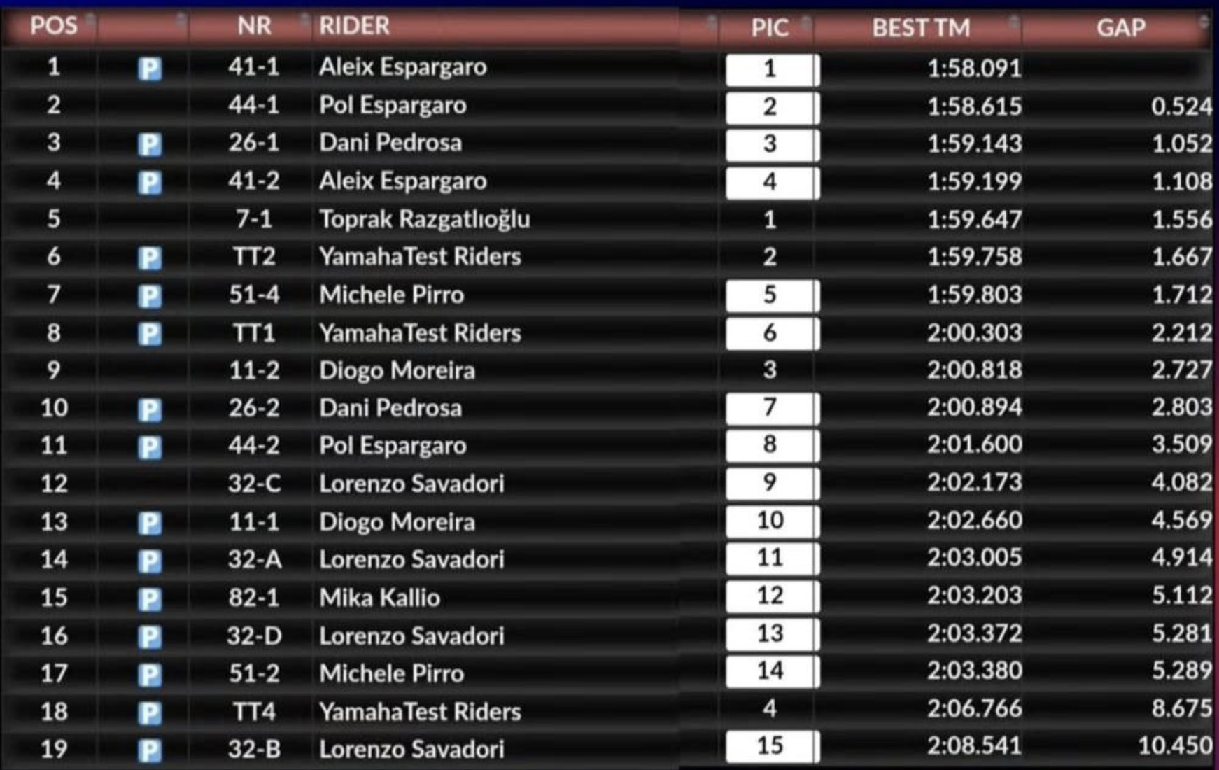 KTM, on the tails of their team presentations for Red Bull KTM Factory Racing and Red Bull KTM Tech3, were second and third with Pol Espargaro, half a second off the top, and MotoGP Hall of Famer Dani Pedrosa another half a second in arrears. Mika Kallio was also out on track to put in a few laps, further down the timesheets.