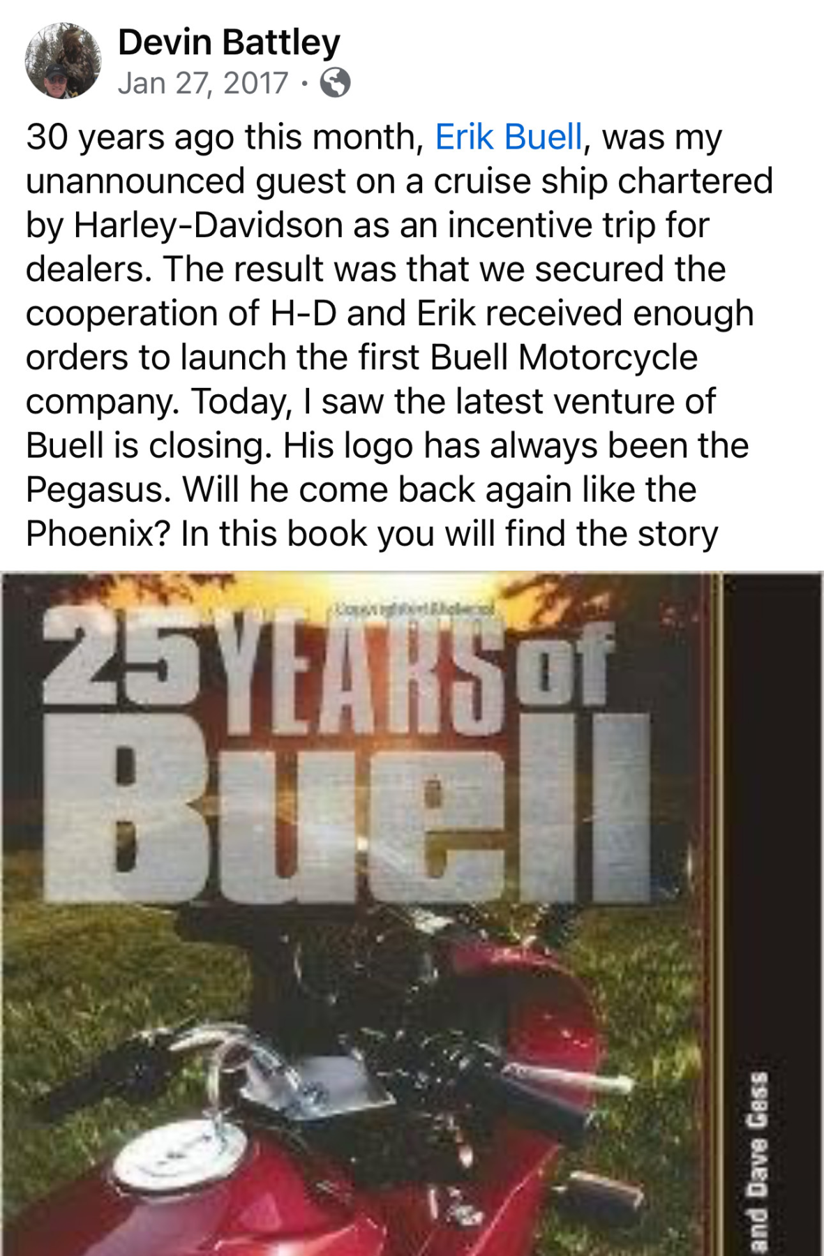 One of Battley’s claims to fame was taking Erik Buell with him on a 1987 Harley-Davidson dealer-incentive cruise. On the cruise ship, Battley convinced Harley-Davidson executives to commit to ordering enough motorcycles to make it possible for Erik Buell to launch the Buell Motorcycle Company.