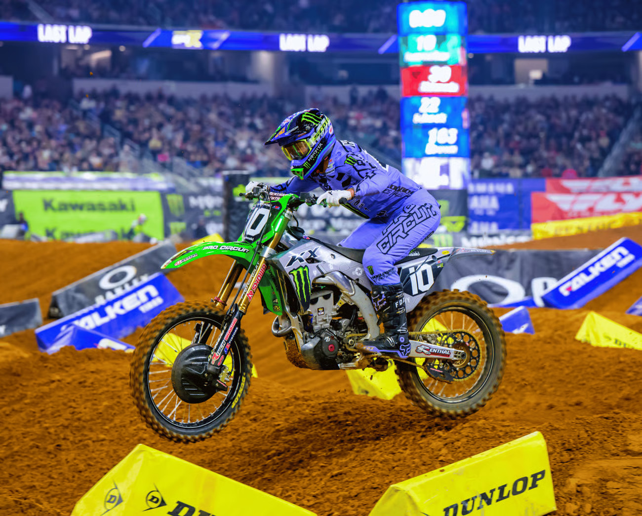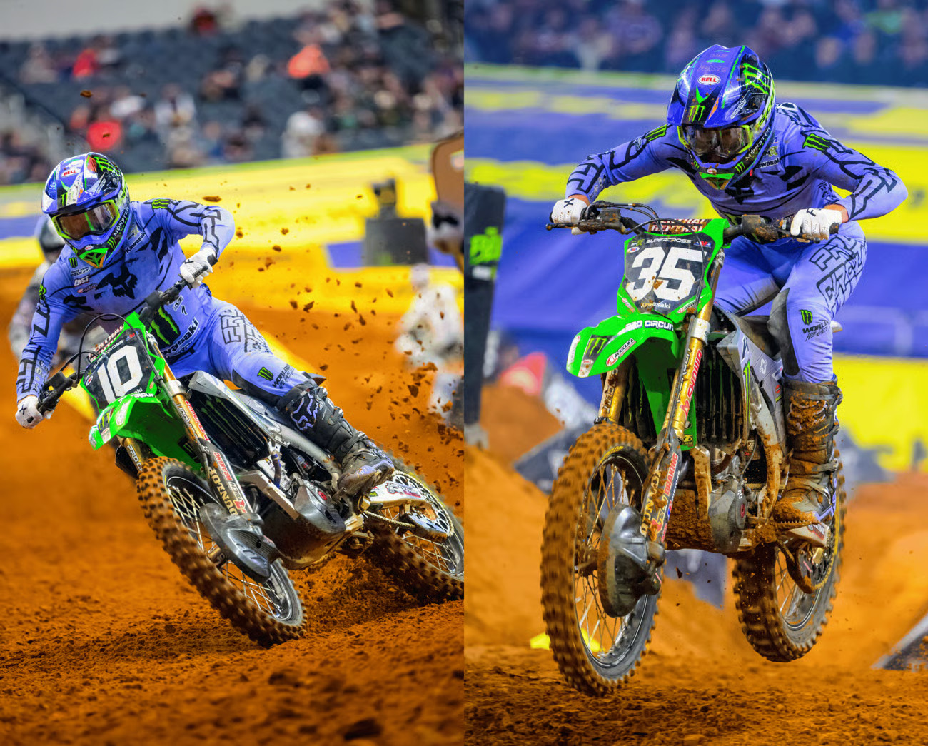 The red Texas dirt inside AT&T Stadium required a fine balance between precision and aggression at Round 7 of the Monster Energy AMA Supercross season; the event also paid points toward the SMX World Championship. The riders faced deep ruts and a slick whoop section that broke down dramatically throughout the racing. The domed stadium hosted the Military Appreciation Race with military veterans in attendance and bike and gear graphics honoring the service members.