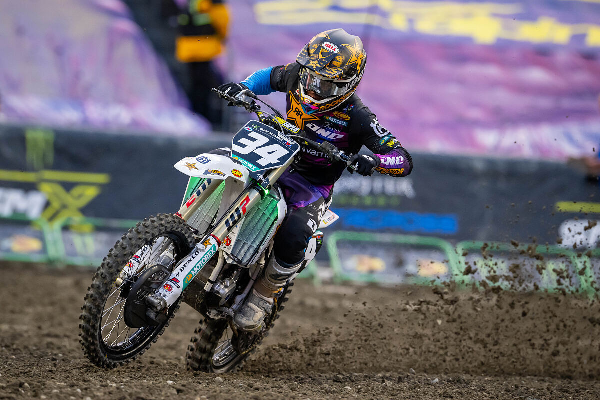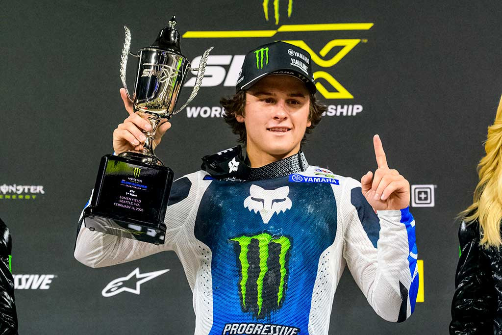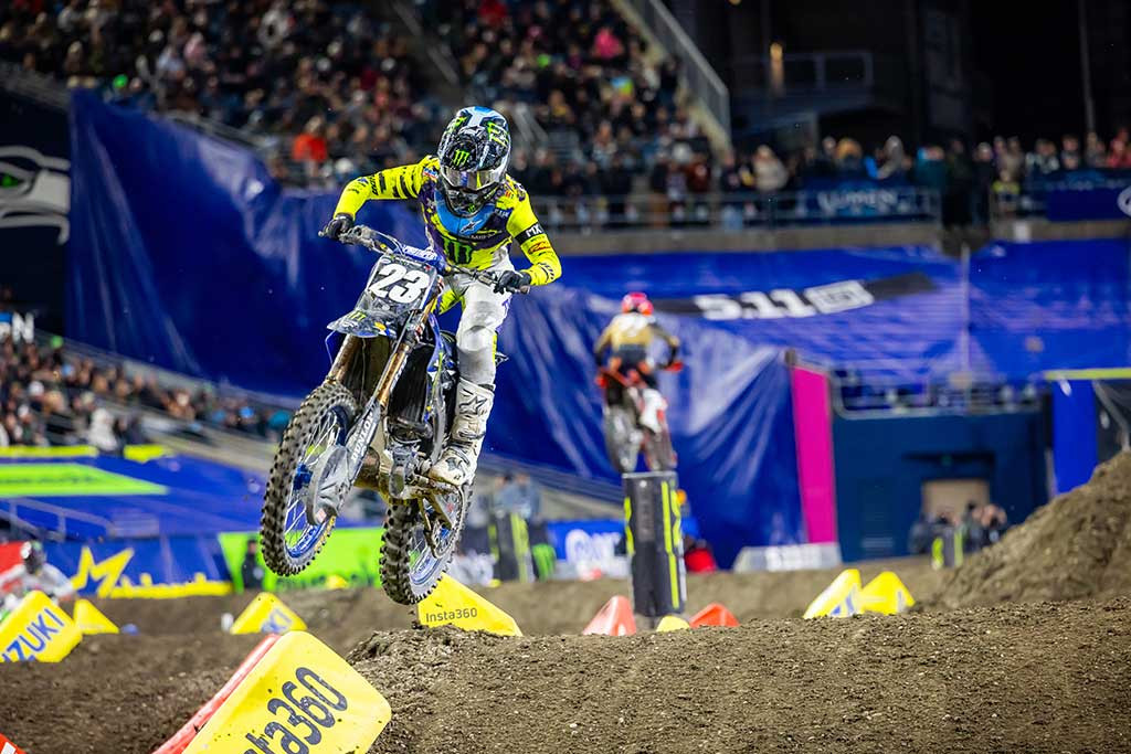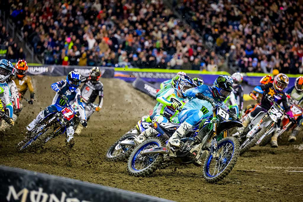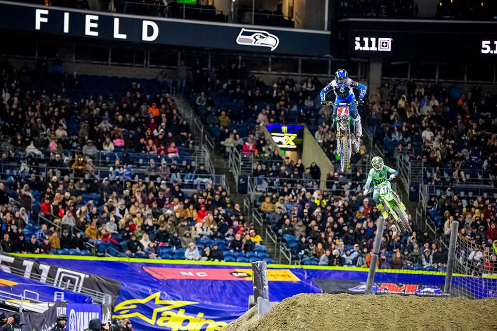 Round 6 of the Monster Energy AMA Supercross season presented a rutted and technical track inside Lumen Field in Seattle, Washington. The racing conditions in the open stadium were a stark departure from the previous round’s hardpacked dirt under a domed stadium. The soft, wet soil rutted up and deteriorated quickly throughout the event, which paid championship points for both the Supercross season and the SMX World Championship.