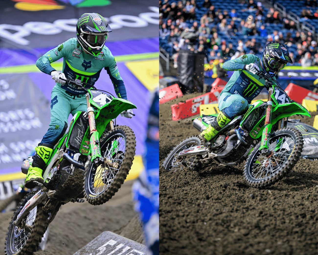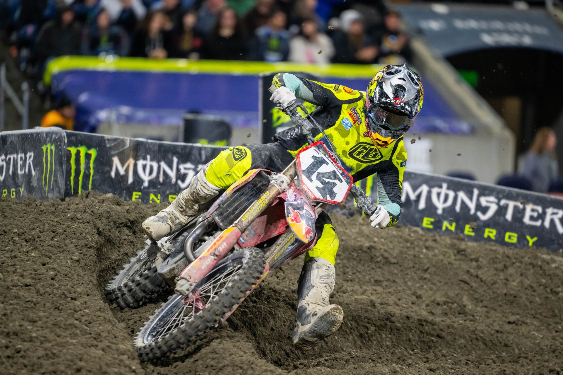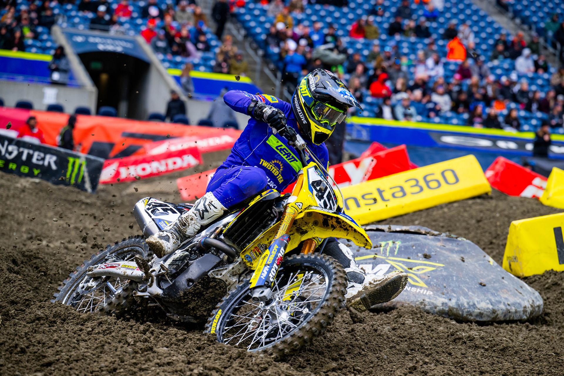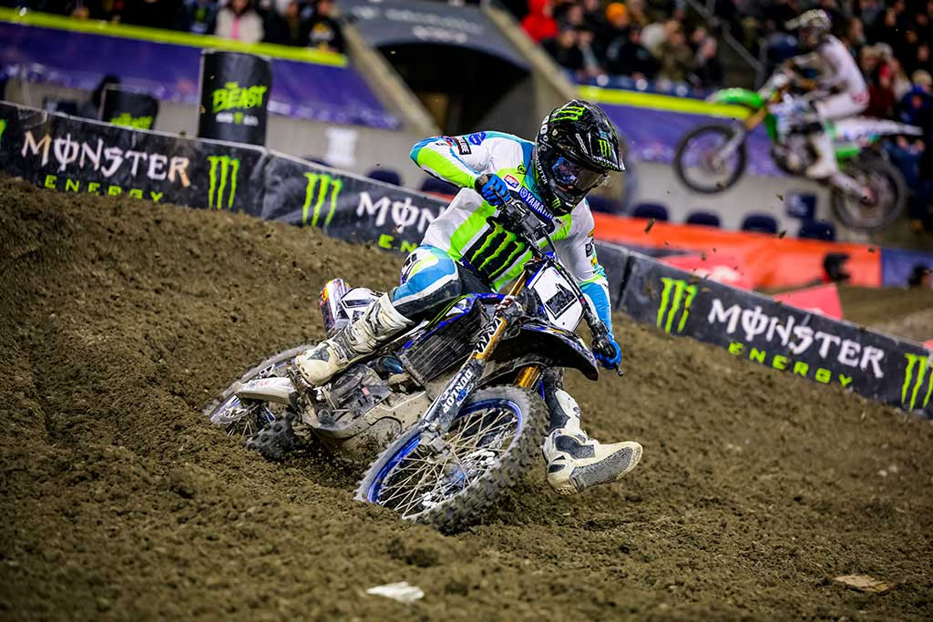 Round 6 of the Monster Energy AMA Supercross season presented a rutted and technical track inside Lumen Field in Seattle, Washington. The racing conditions in the open stadium were a stark departure from the previous round’s hardpacked dirt under a domed stadium. The soft, wet soil rutted up and deteriorated quickly throughout the event, which paid championship points for both the Supercross season and the SMX World Championship.
